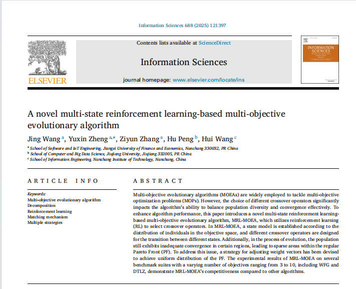 Recently, Jing Wang, a young teacher from the School of Software and Internet of Things Engineering, published a research paper titledA novel multi-state reinforcement learning-based multi-objective evolutionary algorithm in the internationally renowned journal ELSEVIER. The paper introduces a multi-objective evolutionary algorithm (MRL-MOEA) based on multi-state reinforcement learning, which combines the decision-making capabilities of reinforcement learning with the demands of multi-objective optimization, significantly enhancing the performance of thealgorithm.